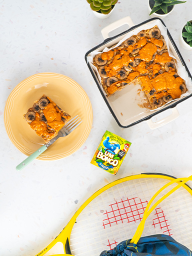 - No fundo do tabuleiro coloque uma camada de banana às rodelas. Verta a mistura e adicione uma segunda camada de banana às rodelas. Cubra com a manteiga de amendoim.