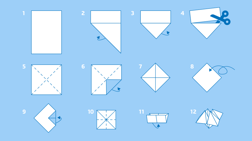 Material: folhas de papel (não de cartolina porque dificulta as dobras) e caneta ou lápis de várias cores.