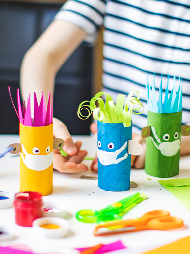 Material: rolos de papel higiénico, tesoura, cola, fita-cola, tintas, lápis ou canetas de cor.